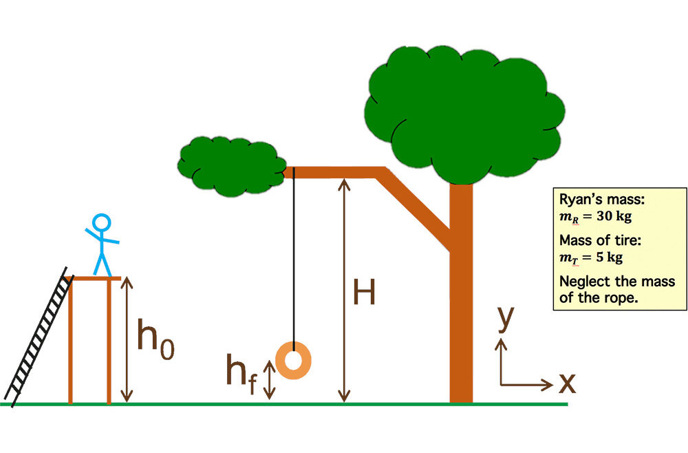A family decides to create a tire swing in their backyard for their son Ryan. They tie a nylon rope to a branch that is located H = 16 m above the earth, and adjust it so that the tire swings hf = 1 m above the ground. To make the swing more exciting, and so they don’t have to push Ryan all the time, they construct a launch point that is h0 =13 m above the ground. You are their neighbor, and you are concerned that the swing might not be safe, so you look up how strong nylon rope is and find out that the maximum tension it can withstand before breaking is 800N. Is the swing safe?